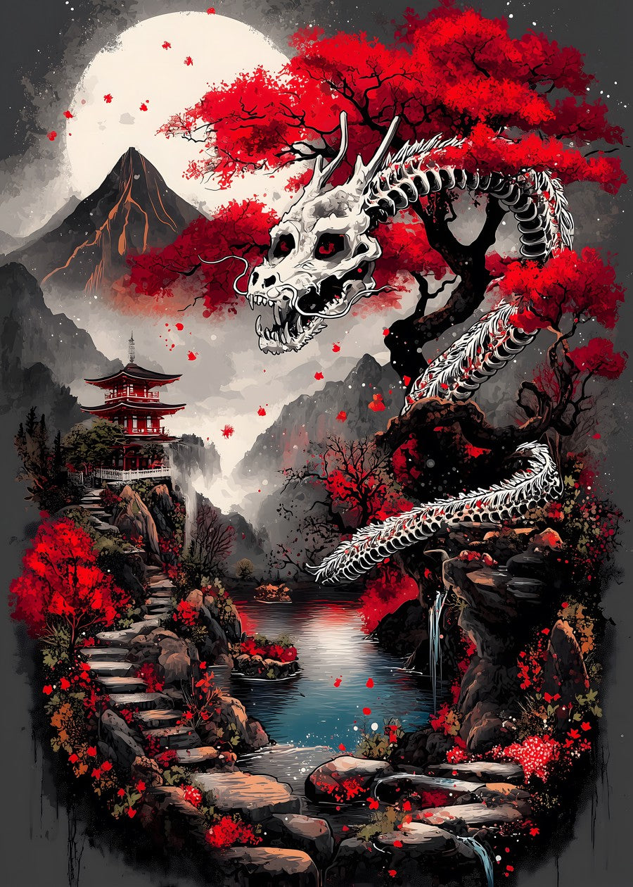 A skeletal dragon entwines in a vibrant red tree, overlooking a serene temple pond.