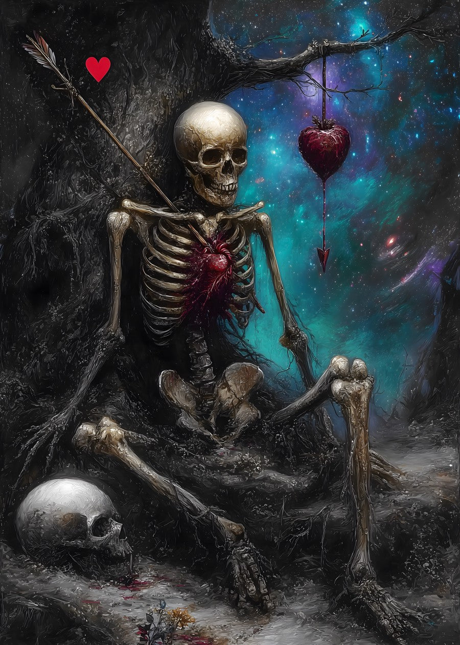 A skeleton pierced by love's arrow in a cosmic realm, surrounded by mystery.