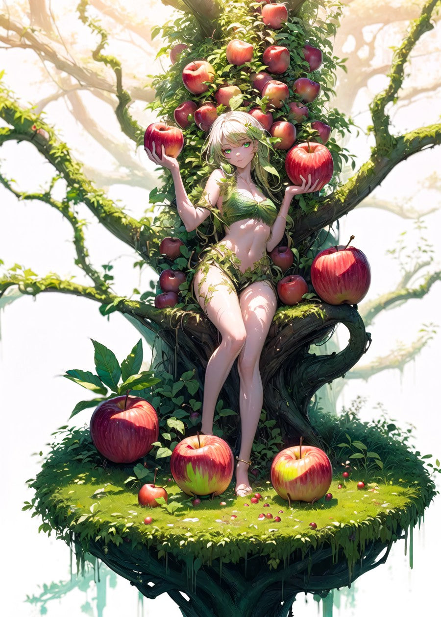A young woman with green hair standing at a tree surrounded by apples. A revealing red and green outfit with intricate patterns.