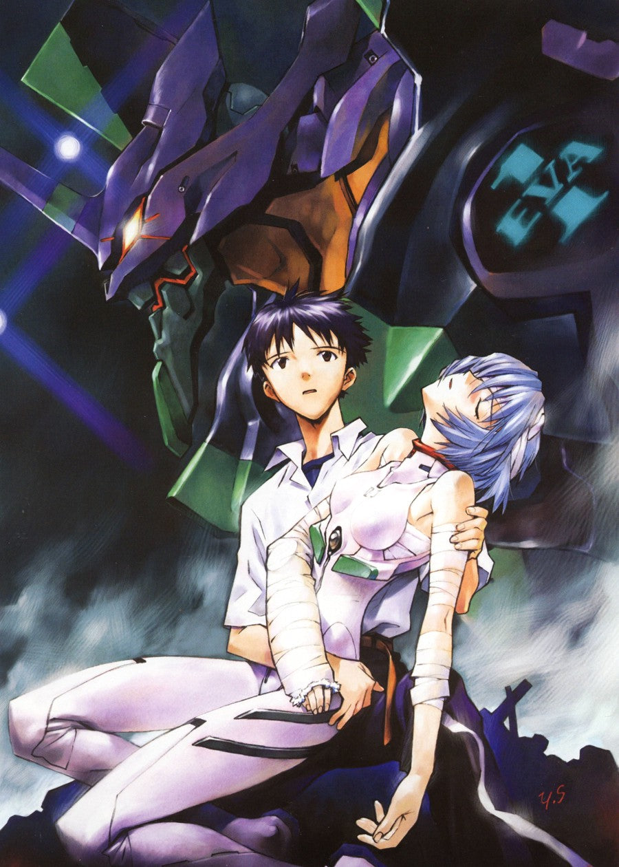 Shinji holds Rei in an emotional moment with Eva Unit-01 looming behind, full of sorrow and depth.