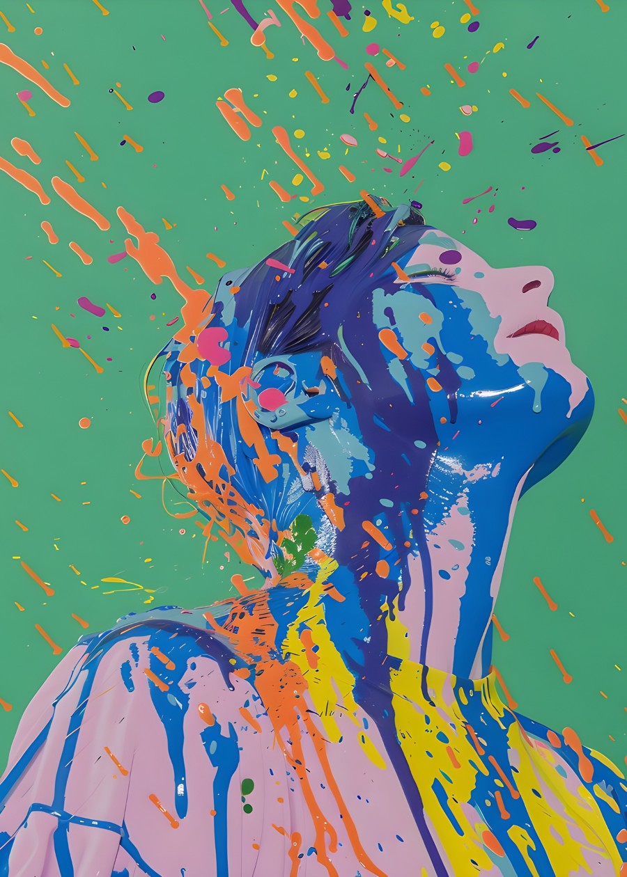 A vibrant splash of color engulfs a serene portrait, bursting with modern energy and bold strokes.