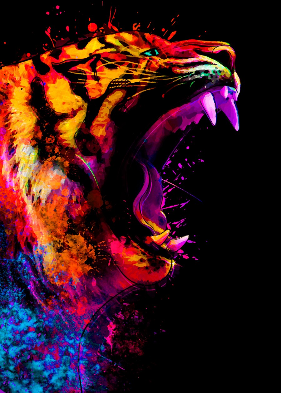 A roaring tiger bursts with a vibrant splash of colors. Its aggressive expression and dynamic hues create a powerful, energetic artistic.