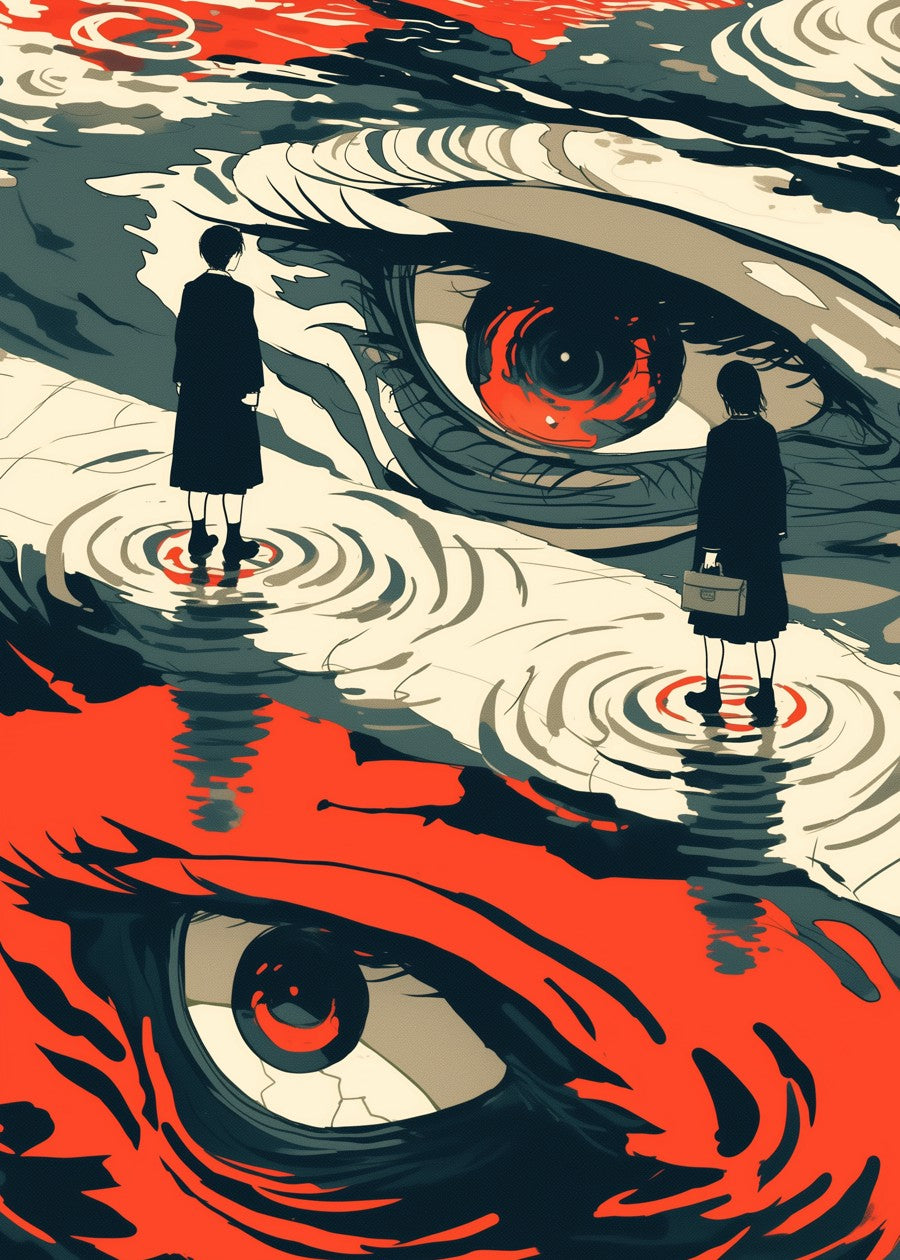 The image features two figures standing on a surface that reflects a large, stylized eye.