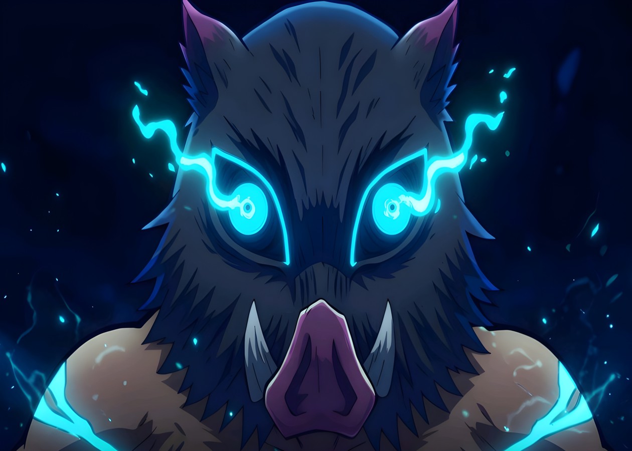 Close-up of the boar-masked character reveals glowing blue electrified eyes, radiating raw primal power.