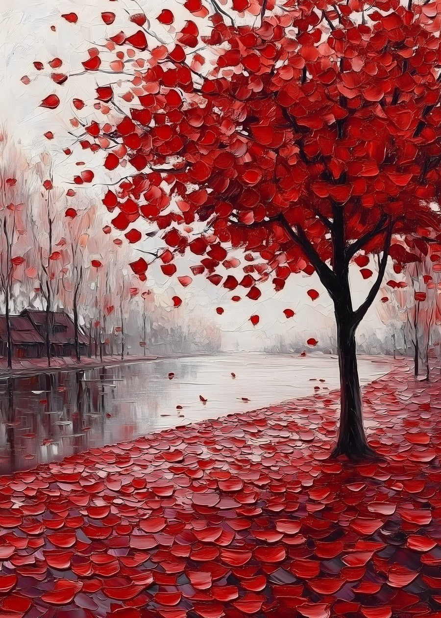 A vibrant red tree sheds its leaves by a serene lakeside, capturing autumn's fleeting beauty.