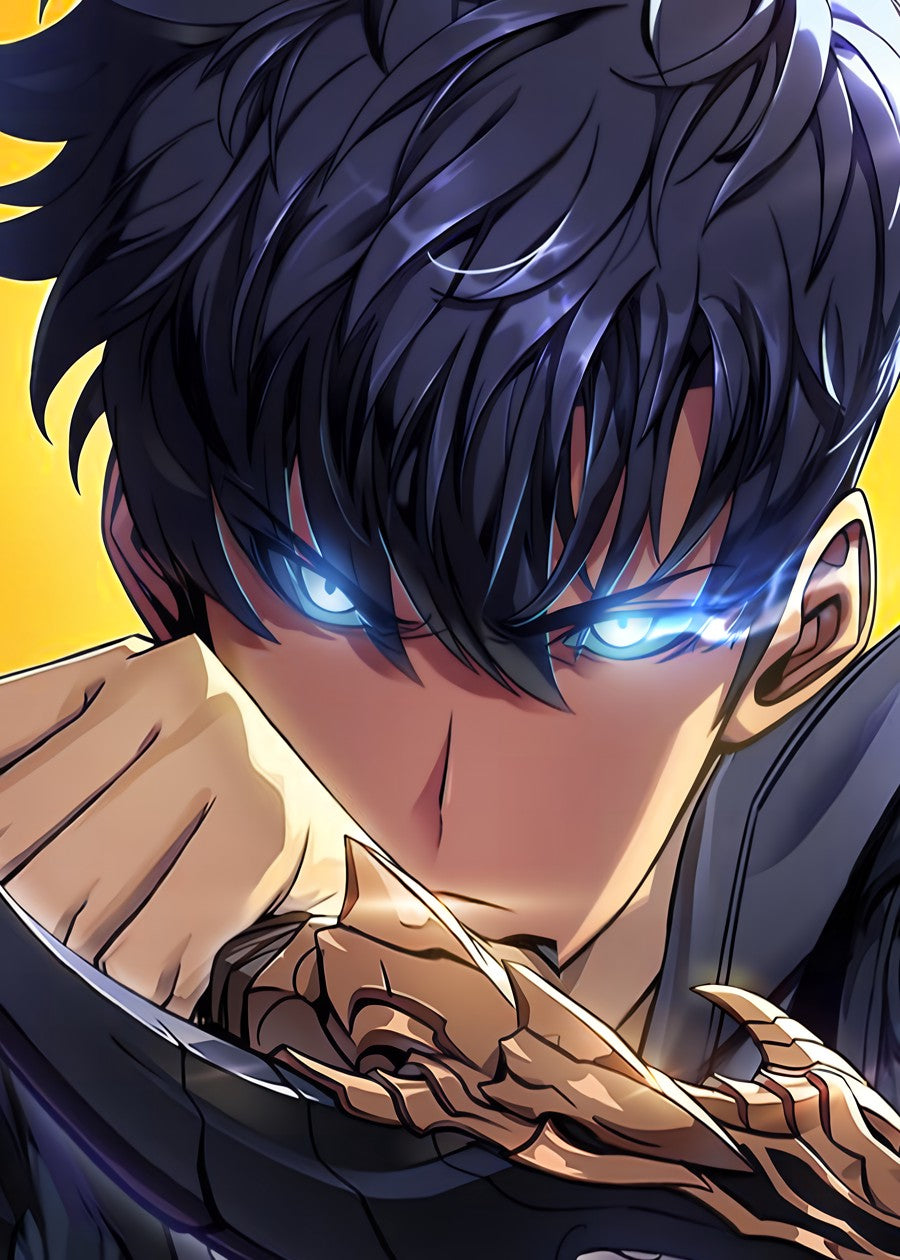 With a glowing blue eye and dagger in hand, Sung Jinwoo prepares for a swift, lethal strike from the shadows.