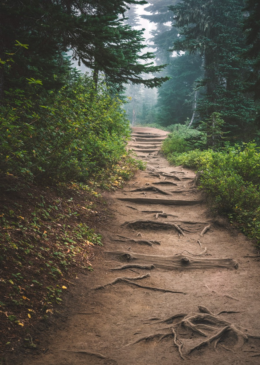 A dirt nature trail on the way to Mount Rainier an early morning hike with fog and trees. Spring season with deep green colors.