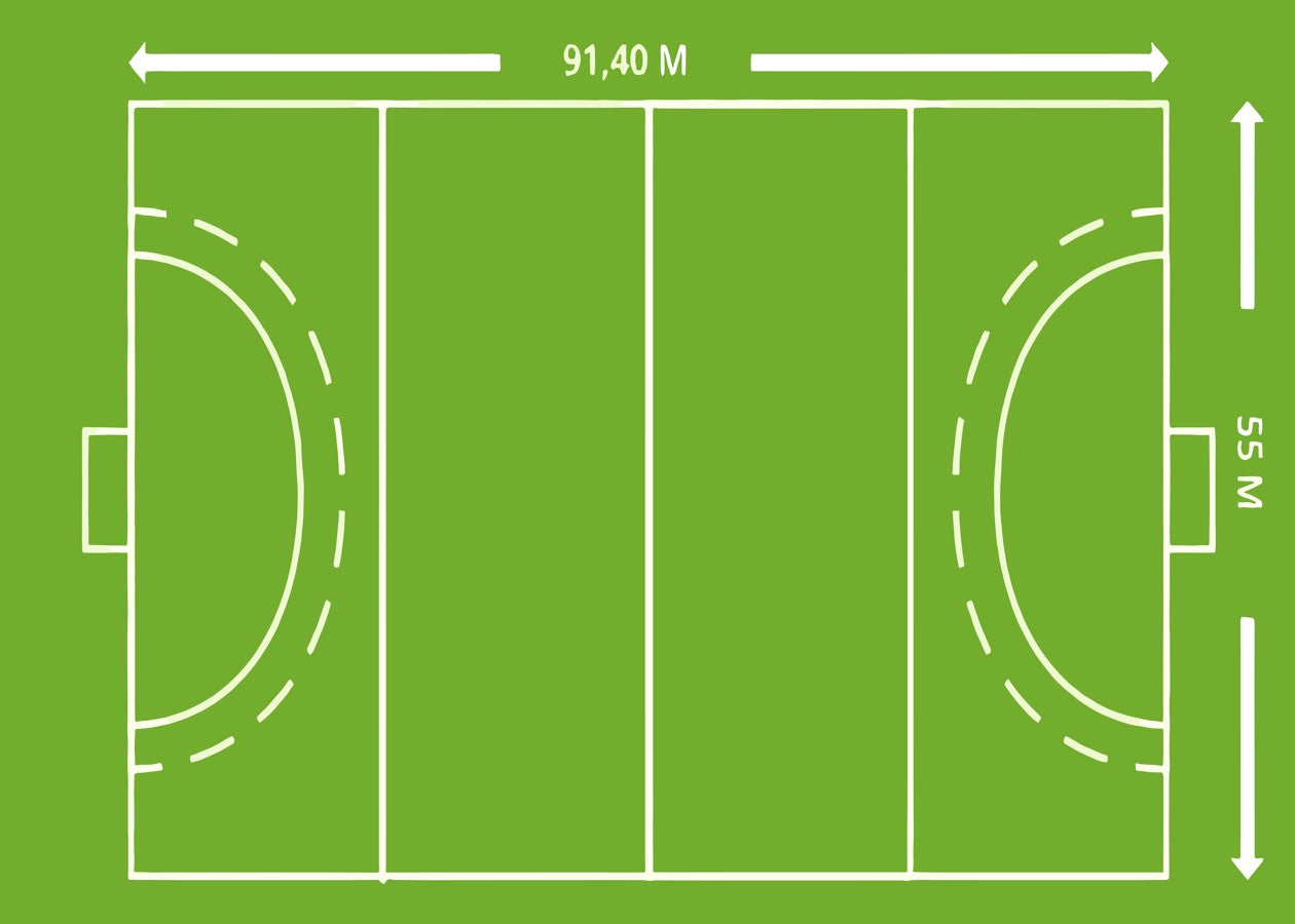 A field hockey pitch diagram in green with key field markings, goal circles, and labeled dimensions of 91.40 meters in length and 55 meters.