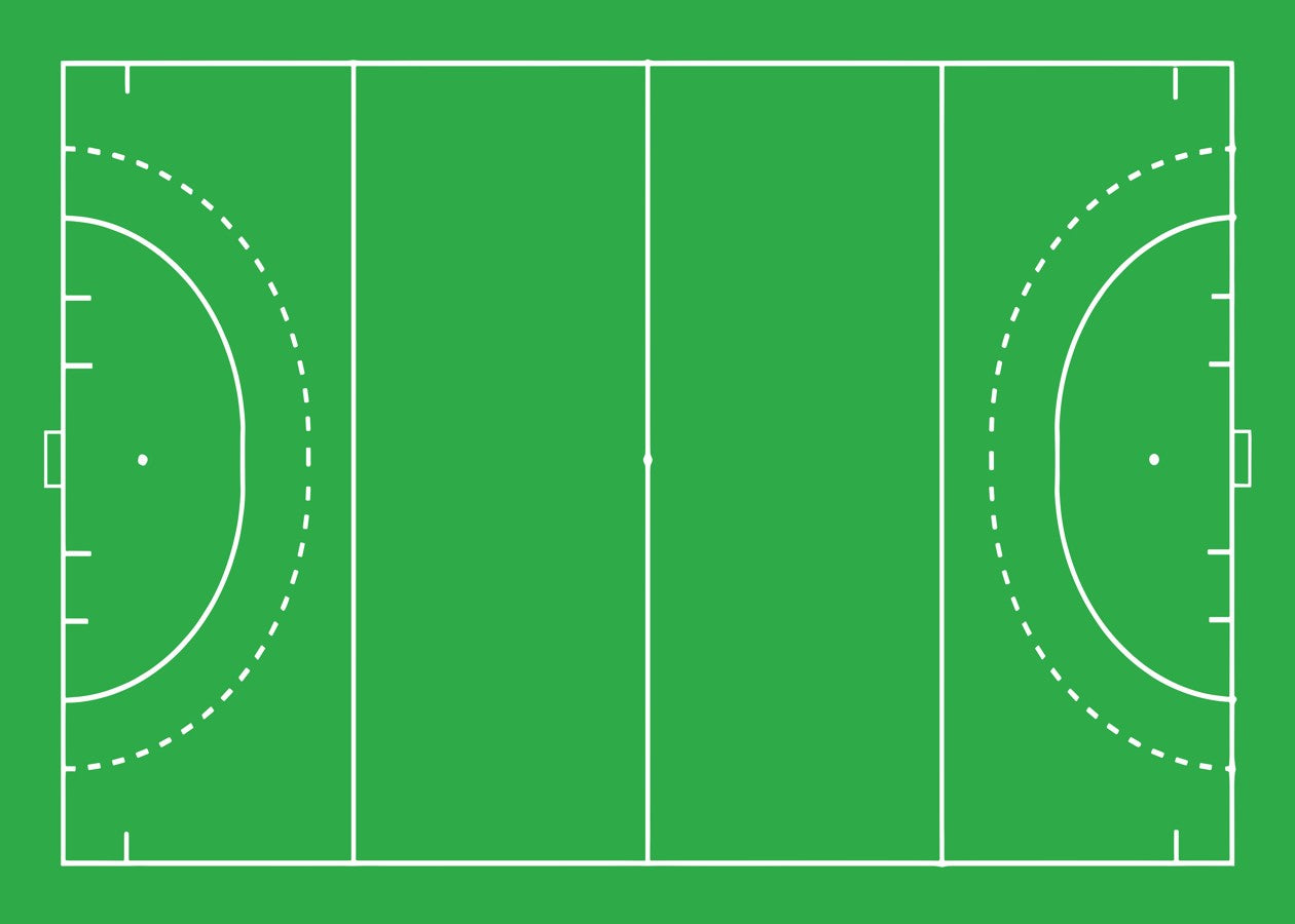 A graphic of a field hockey pitch in green, with crisp white markings for zones, goal areas, and a center circle.