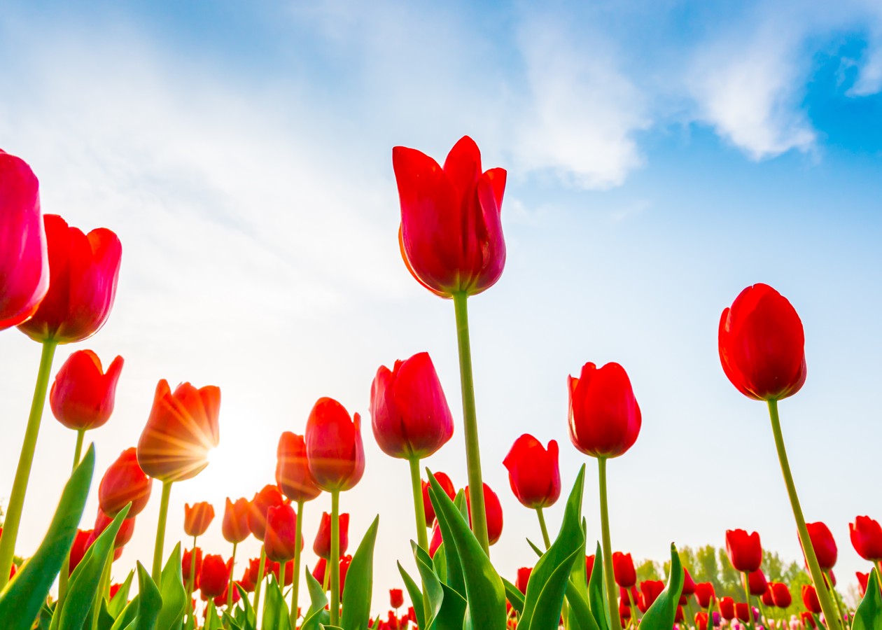 Bright red tulips stretch to the sky in a sunny field, basking in light and joy. Springtime energy at its peak.