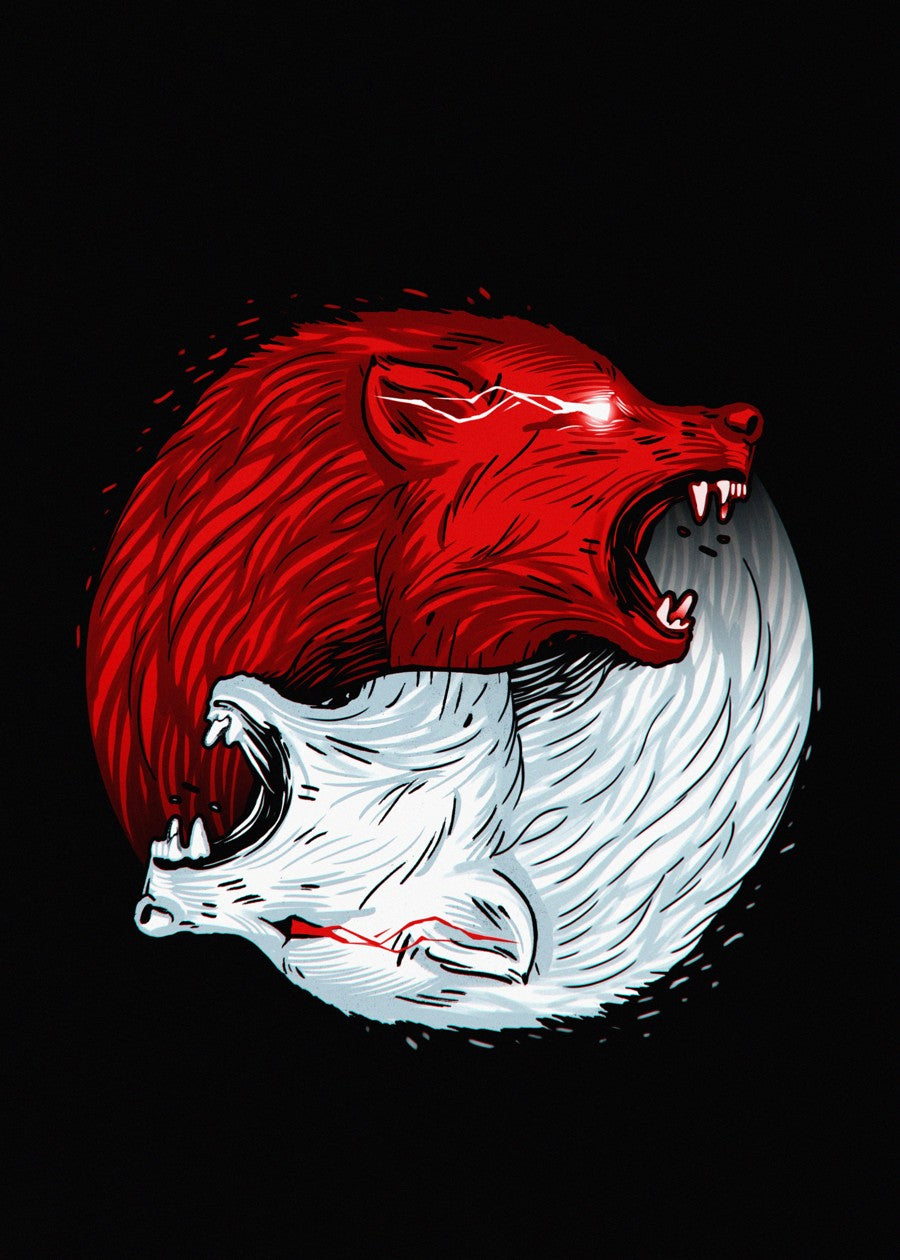 Two fierce wolves, one red and one white, form a yin yang symbol. They are snarling, with glowing eyes and sharp teeth.