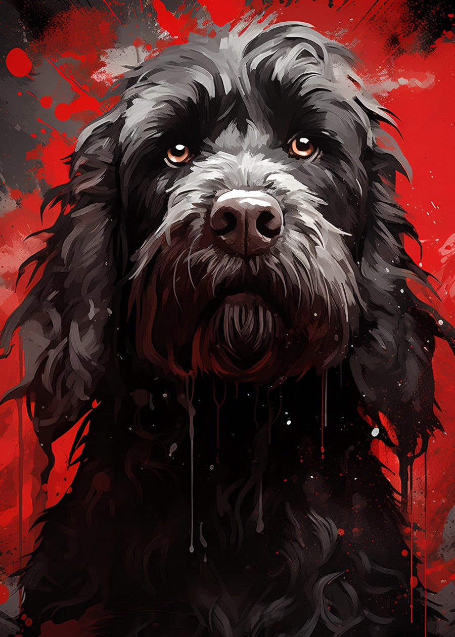 A close-up of a furry, dark-haired dog with expressive eyes, against a vibrant, abstract background of red and black paint splatters.