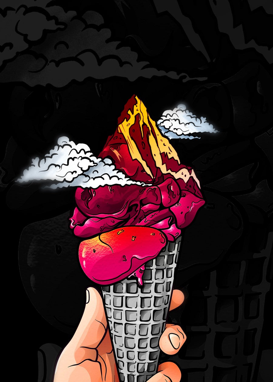 This vibrant piece depicts a hand holding a cone topped with a dramatic, red and yellow volcano-like mountain under dark clouds.