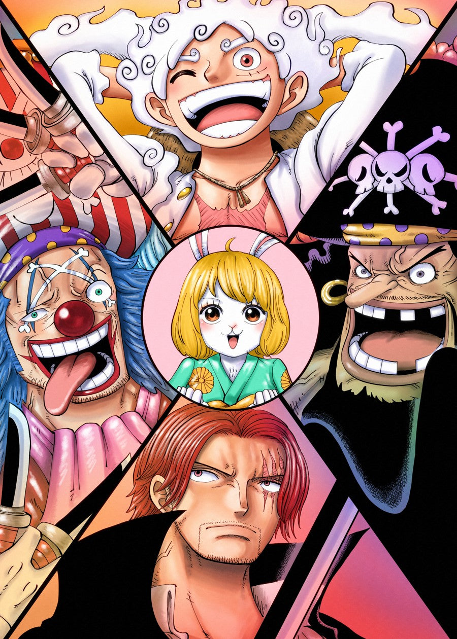 A diverse collection of One Piece characters, including Luffy, Shanks, Uta, and other Straw Hat Pirates in "Film Red" style.