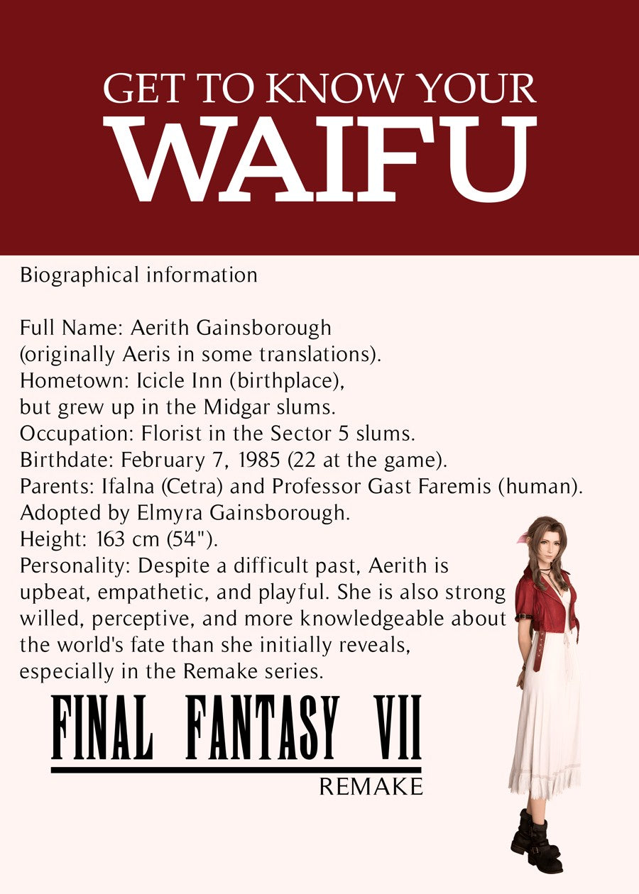 Aerith Gainsborough is a character in the media franchise Compilation of Final Fantasy VII by Square Enix
