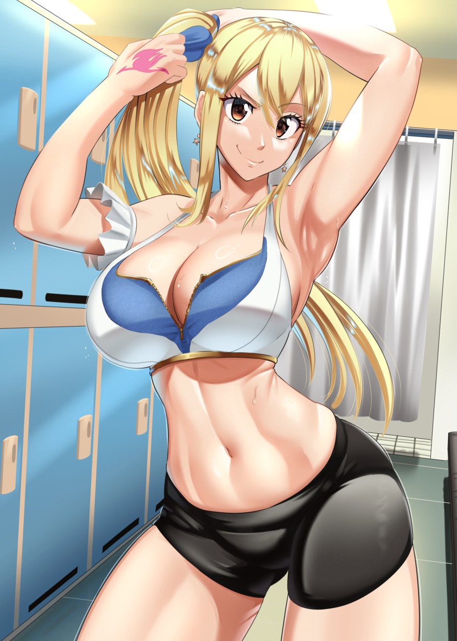 Close-up of Lucy Heartfilia from Fairy Tail in sporty attire, getting ready for a workout. Her determined expression and blonde hair are pro