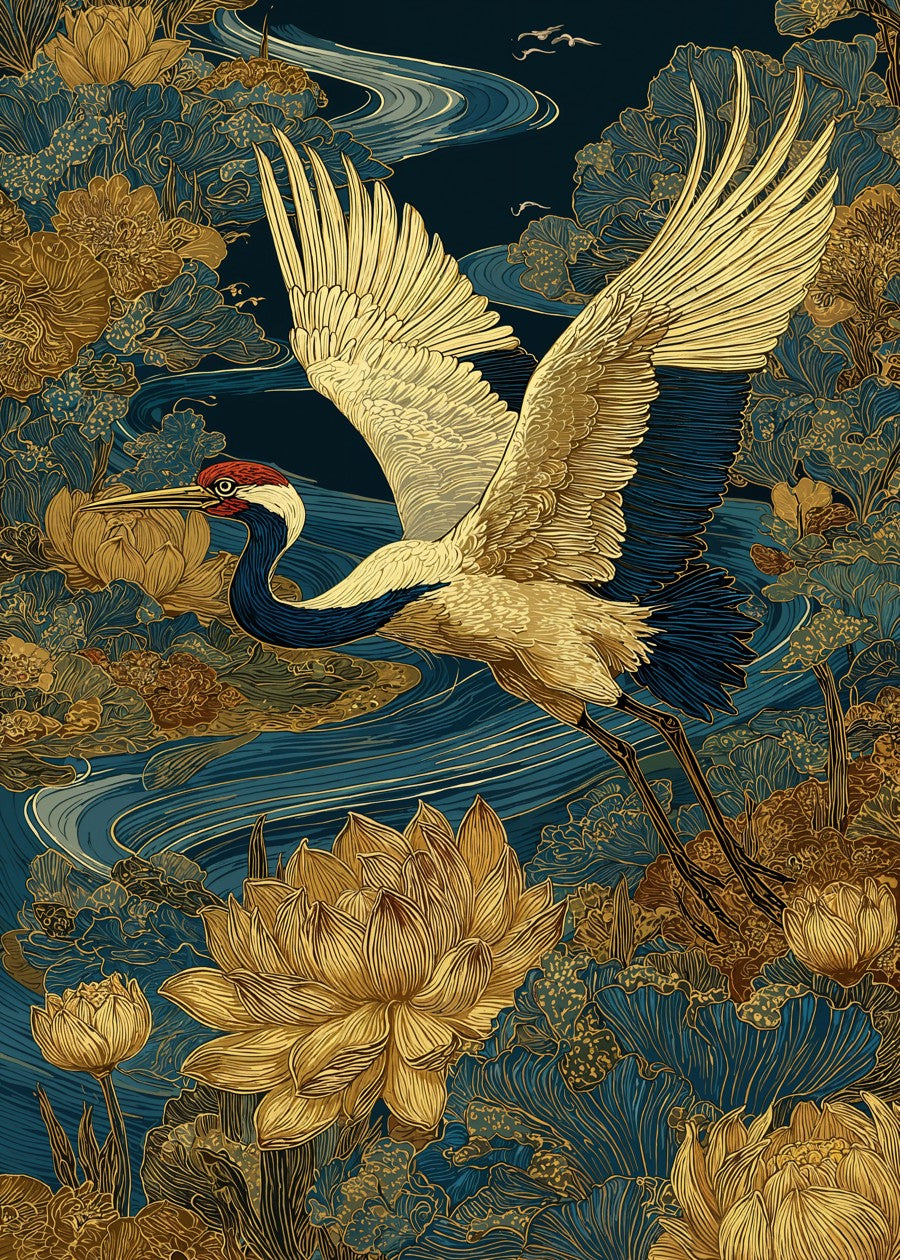 A graceful golden crane soaring over lotus flowers in a flowing dreamscape of deep blues and celestial patterns.