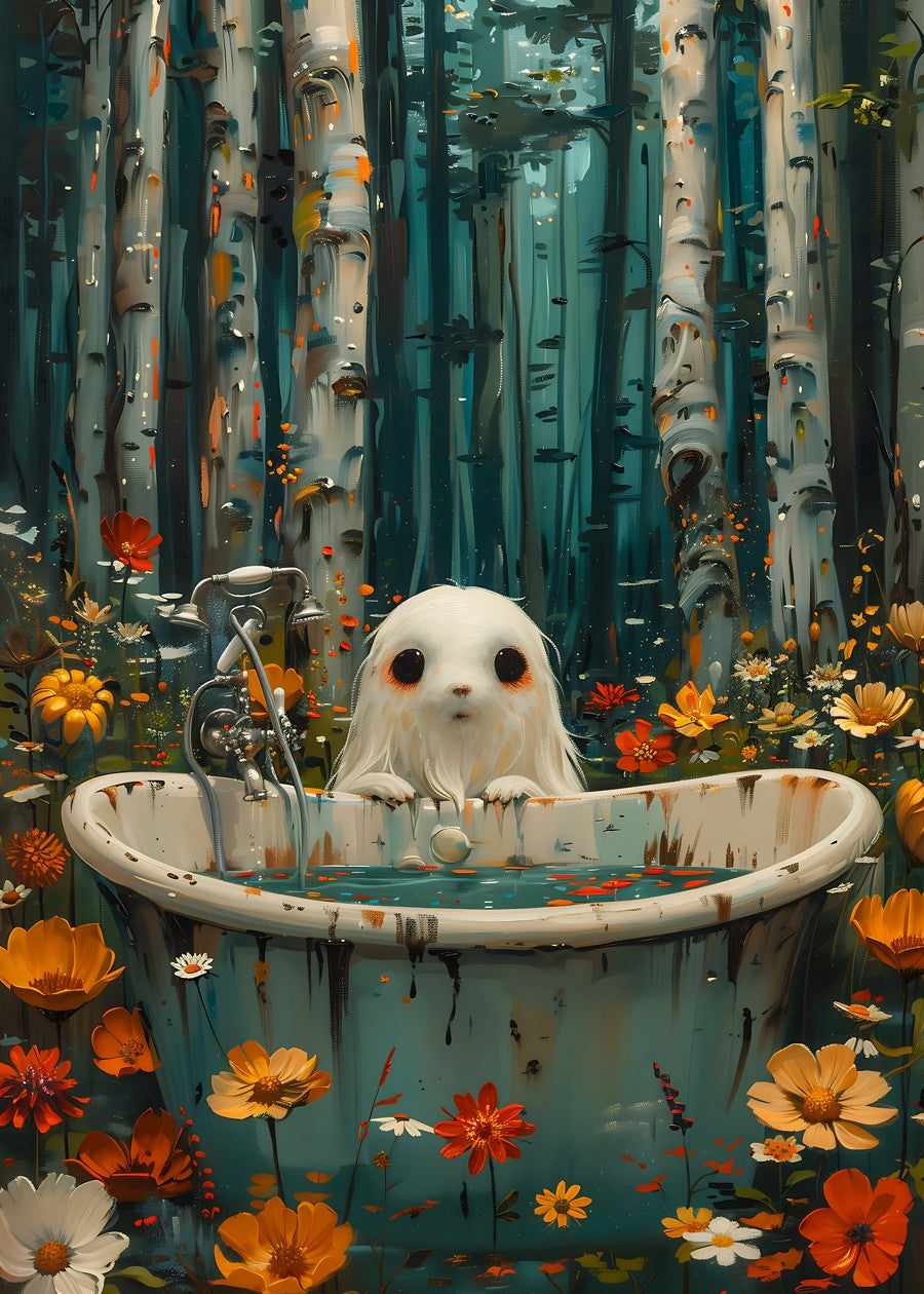 A mystical creature enjoys a whimsical bath in an enchanted forest.