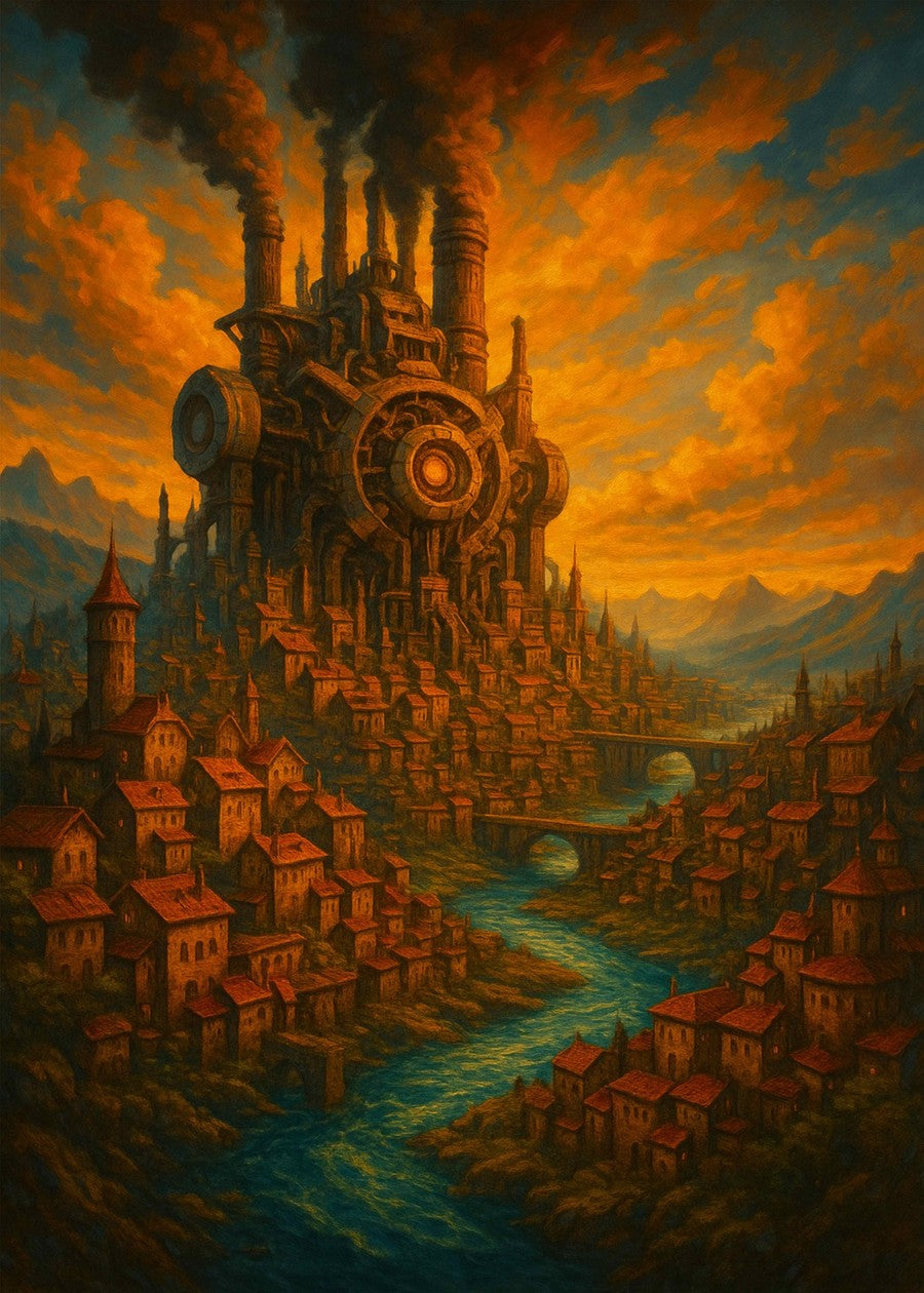 A sprawling river city rises around a colossal steampunk fortress, its towering smokestacks churning black clouds into a fiery sunset sky.