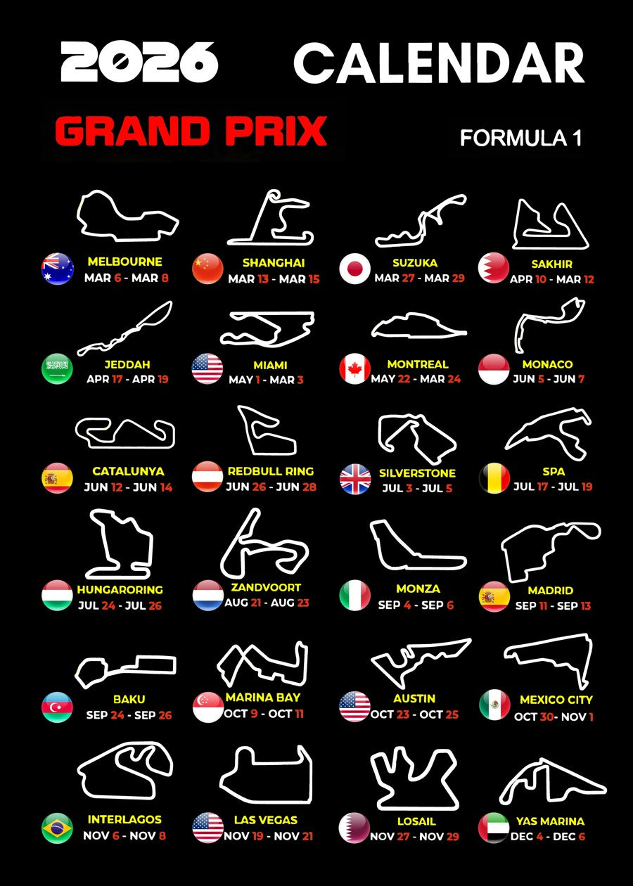 The image displays a Formula 1 Grand Prix calendar for the year 2026.