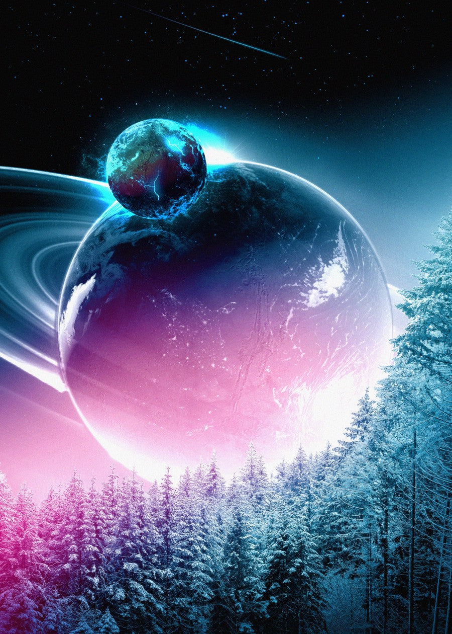 A vibrant alien planet and moon glow over a serene, snow-covered forest under a starry sky.