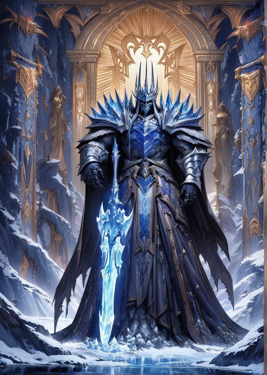 A fearsome ice warlord clad in jagged blue armor stands in a frozen realm, wielding a glowing frostblade of ancient power.