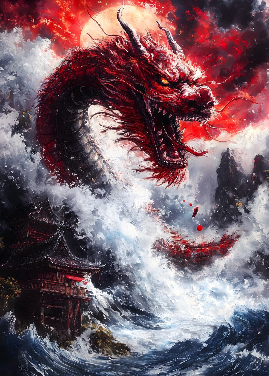 A colossal red dragon emerges from tempestuous waves, shrouded by a fiery sky.