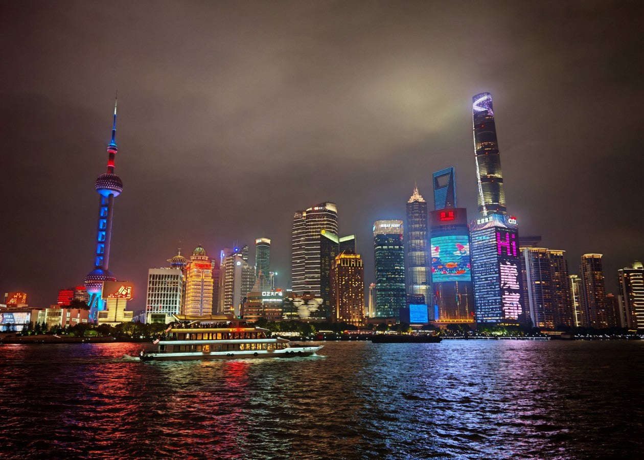 This stunning photograph captures the iconic, neon-lit skyline of Lujiazui, with the Oriental Pearl Tower and futuristic skyscrapers.