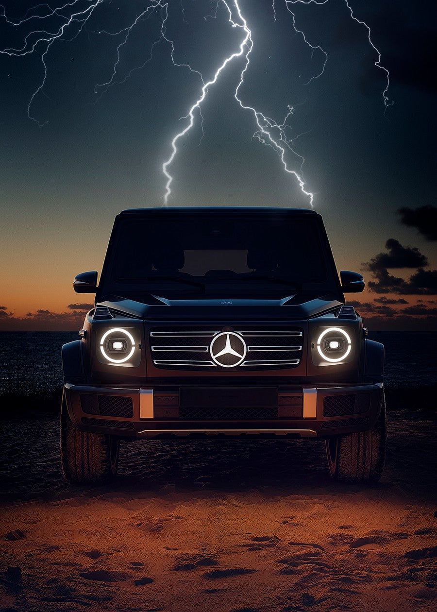 A powerful black Mercedes-Benz G-Wagen sits on a desert landscape, front-facing, as a dramatic lightning storm rages above.