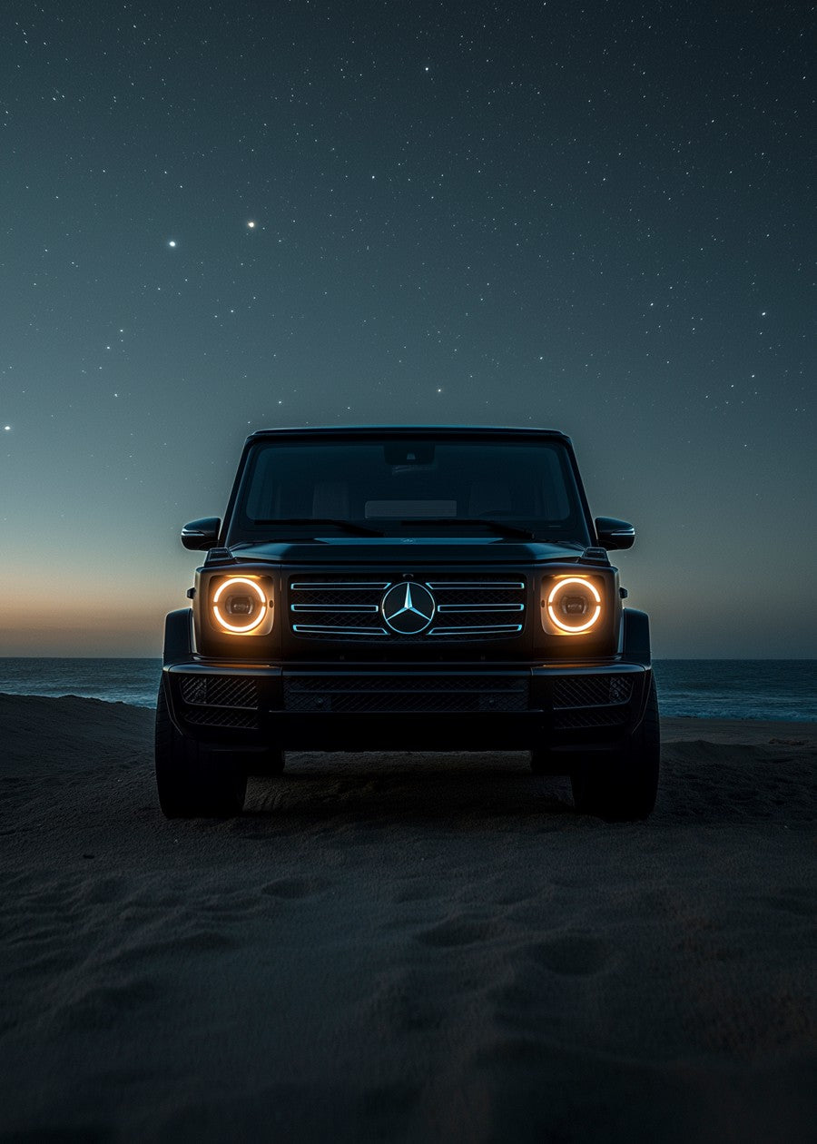 Iconic Mercedes-Benz G-Wagon sits majestically on a sandy beach under a starry night sky, with glowing amber headlights.