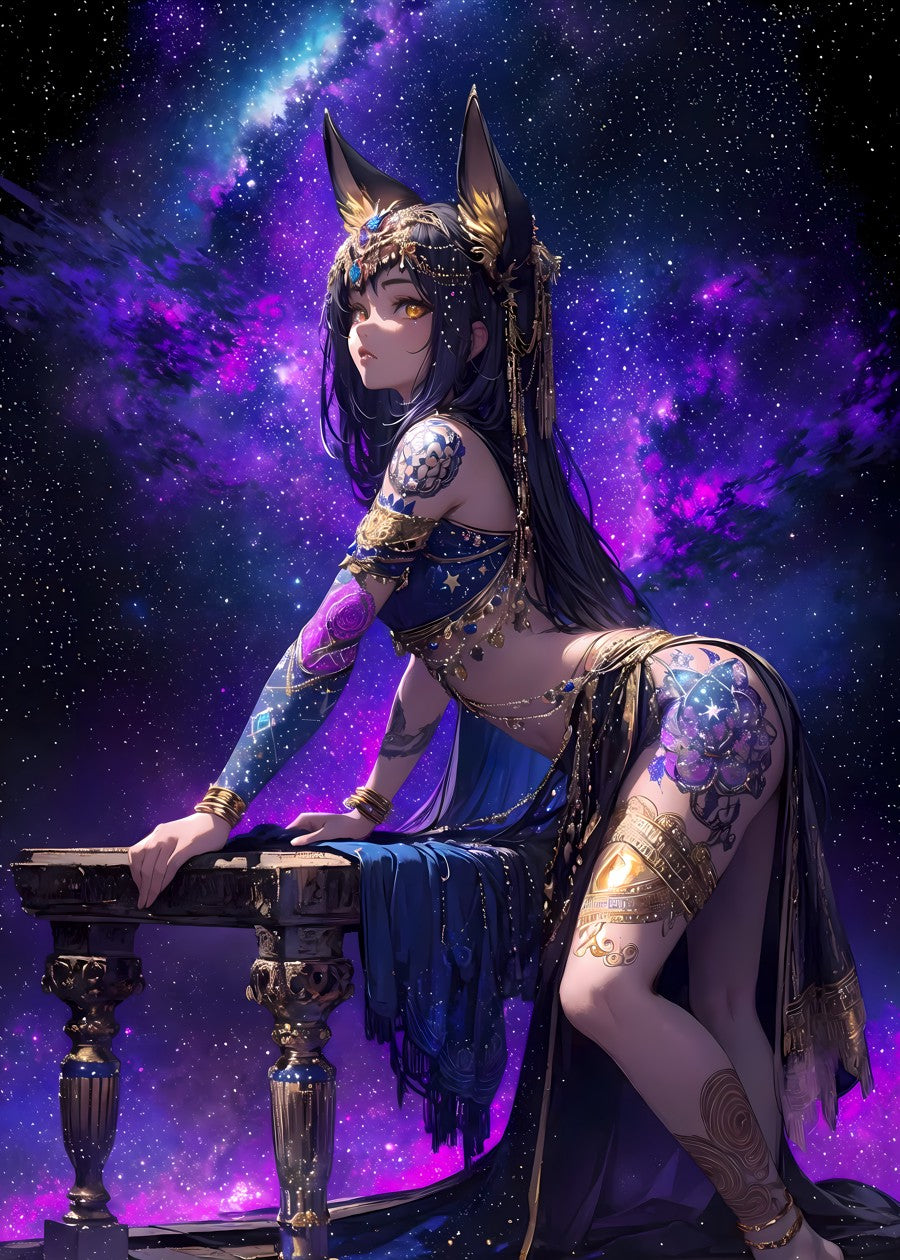 Beautiful Anime Girl in purple night dress surrounded by galaxy sky and stars.