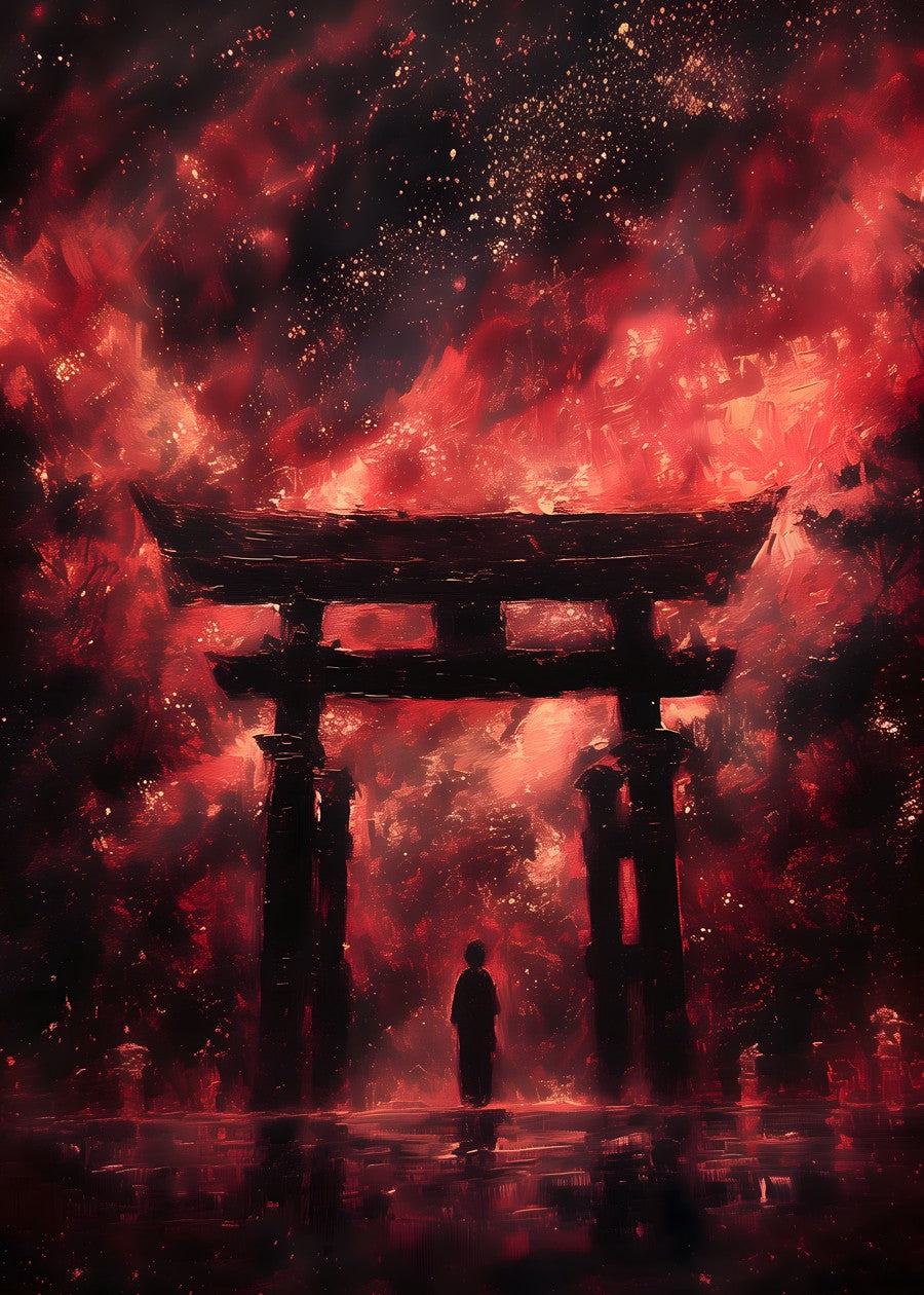 A lone figure stands before a torii under a starlit sky.