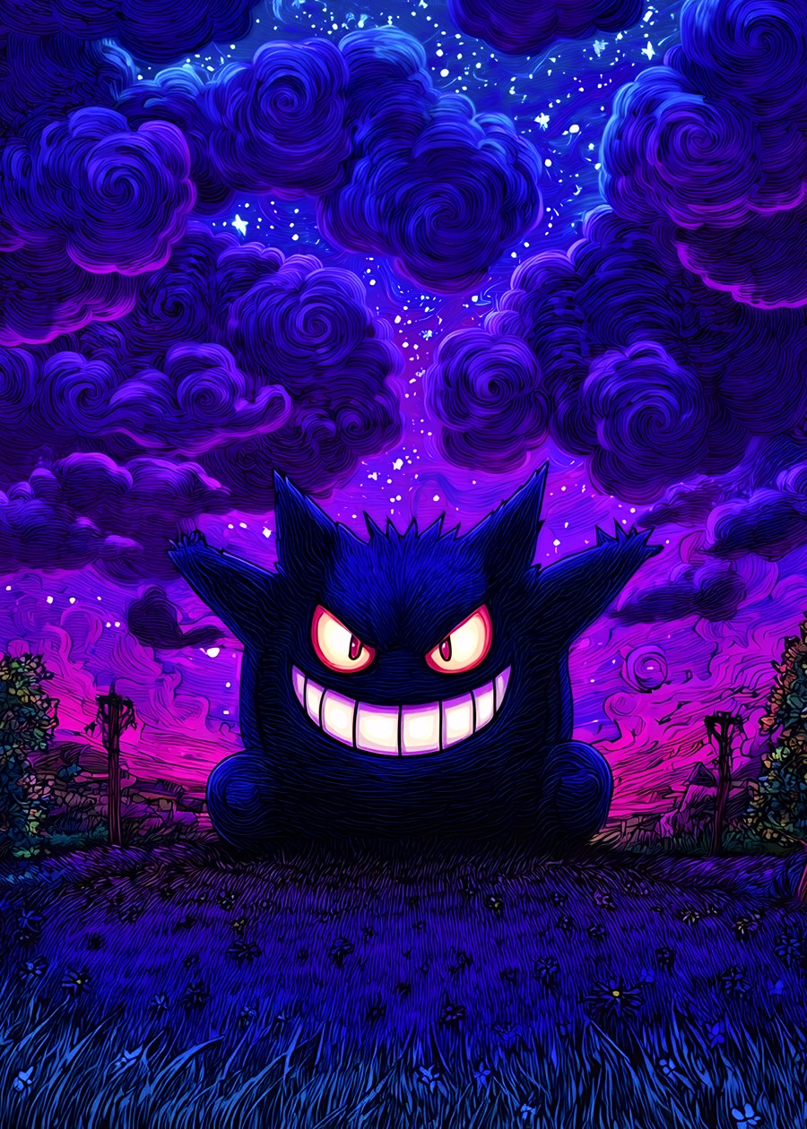 Gengar sits under a starry night, red eyes glowing and grin wide, as purple clouds swirl to form a magical, eerie atmosphere