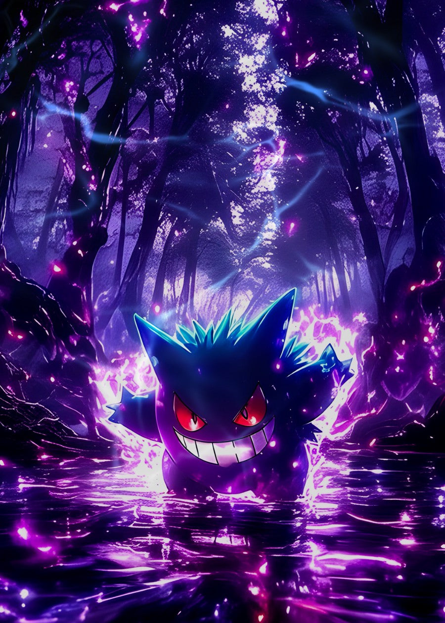 A stunning Gengar, exuding a mystical aura amidst a purple-lit forest.