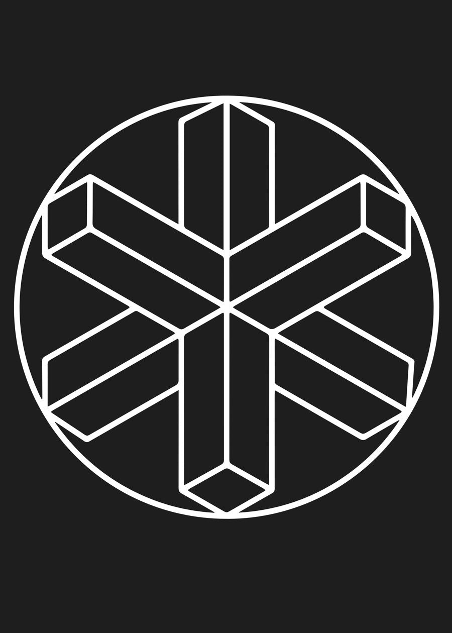 This minimalist line art features an isometric, cube-like grid that forms a stylized snowflake, blending sacred geometry with architectural