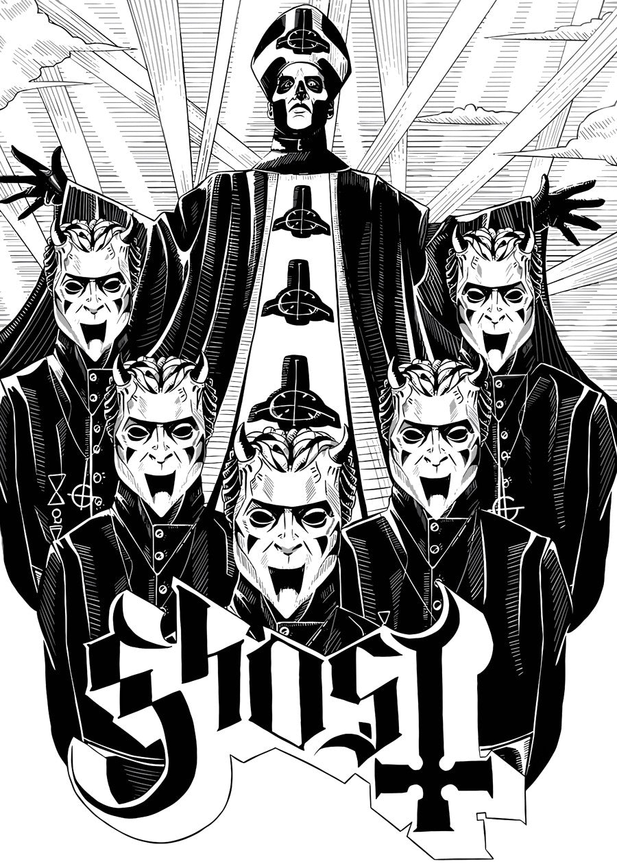 This monochrome illustration showcases the front figure of Ghost in elaborate vestments, arms outstretched in a dramatic pose.