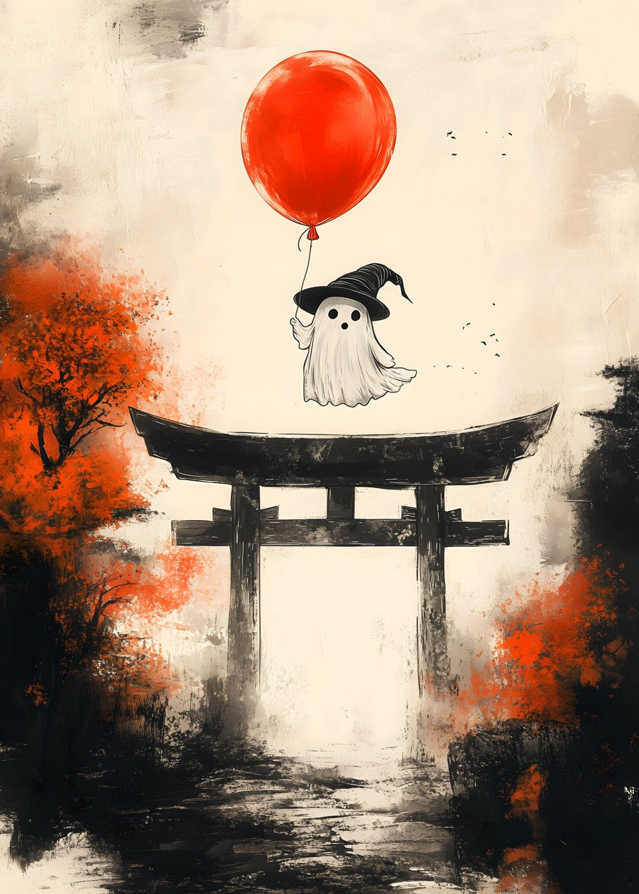 A playful ghost with a witch hat floats above a Torii gate with a red balloon.