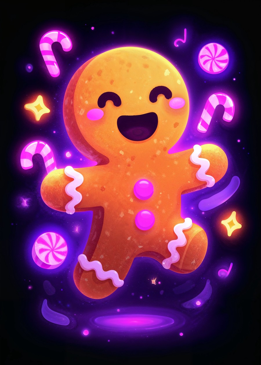 A joyful gingerbread cookie with glowing candy decor, dancing in a neon candy galaxy. Sweet, festive, and cosmic!