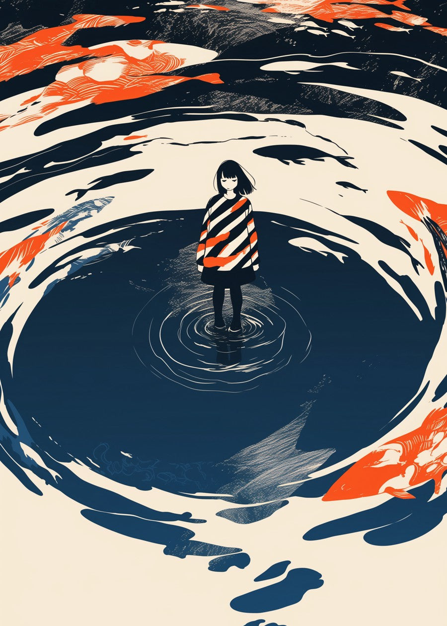 A stylized digital artwork depicts a young girl standing in a pool of dark blue water, creating ripples around her feet.