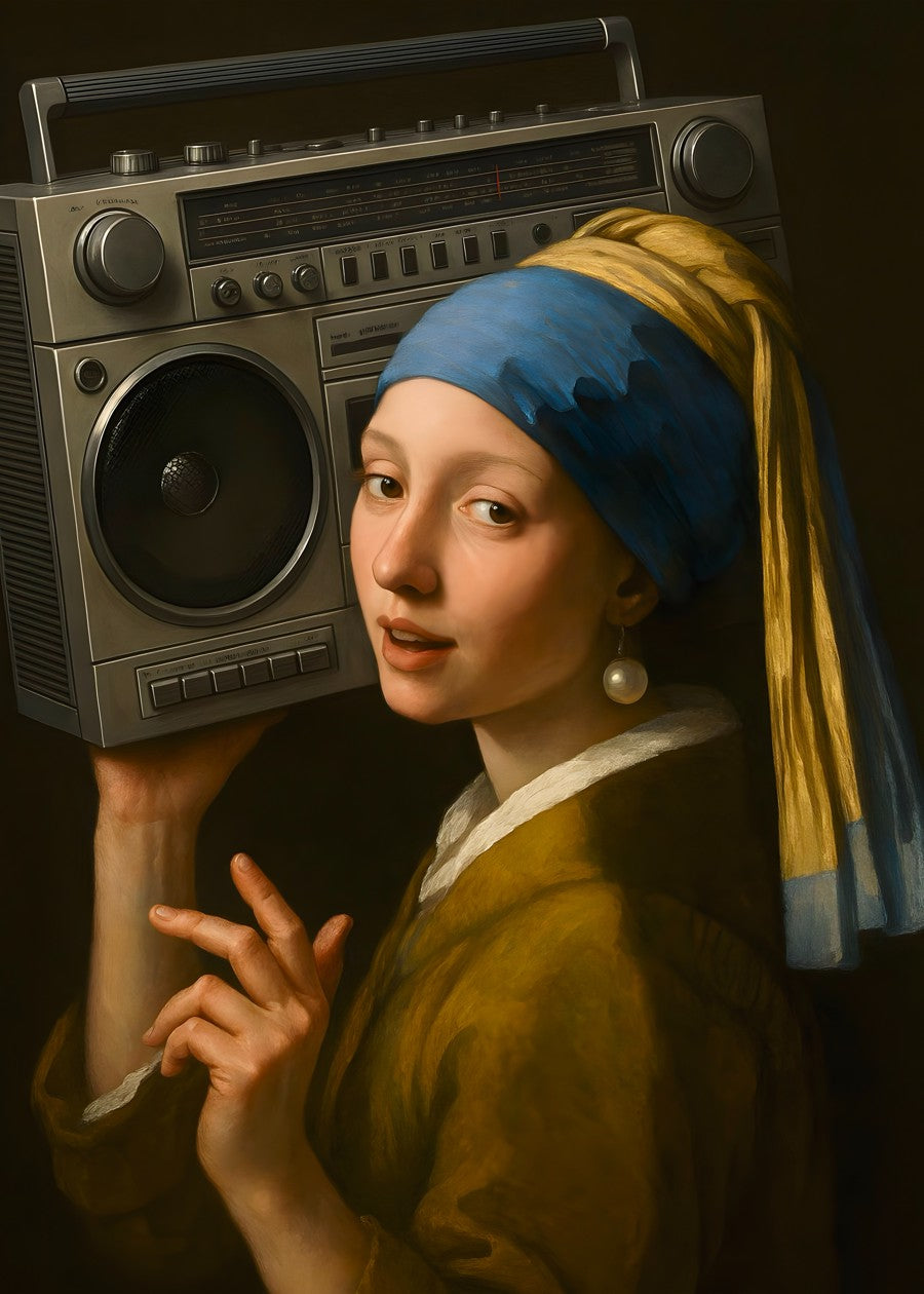 Girl with a ghetto blaster funny portrait. Classical art with a retro 1980s twist. She is listening to rap, hip hop and rock music.