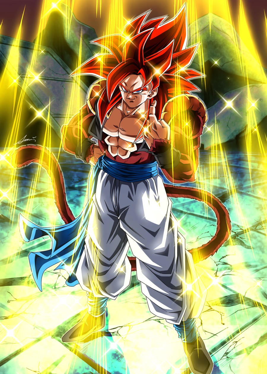 Gogeta SSJ4 stands proudly in a brilliant golden aura. The embodiment of raw power and confidence, ready to face any opponent