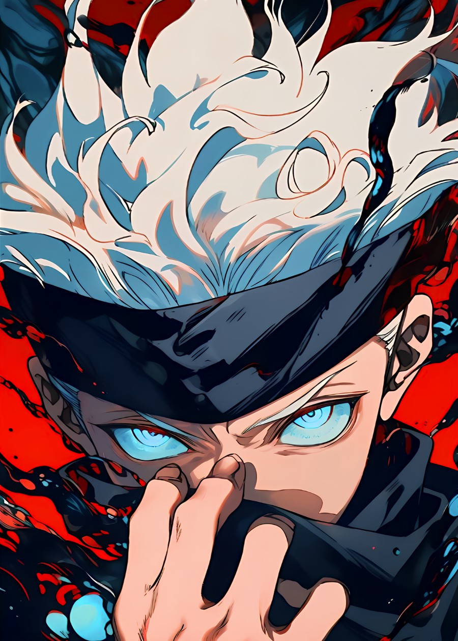 Gojo activates his Domain Expansion with intense blue eyes and white hair swirling in cursed energy. A deadly calm before impact.