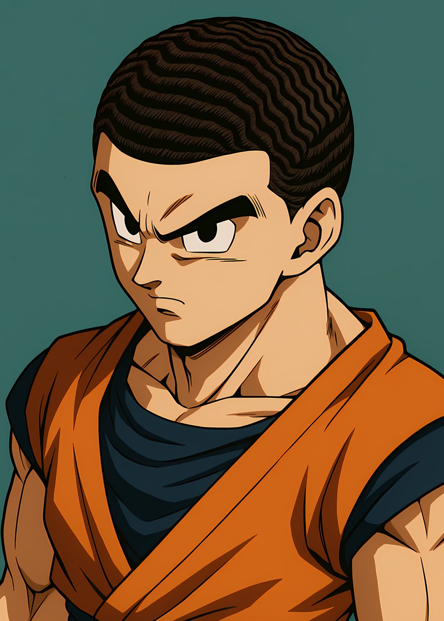 Goku reimagined with 360 waves and classic gi. Bold anime style with modern twist and clean cel shading.