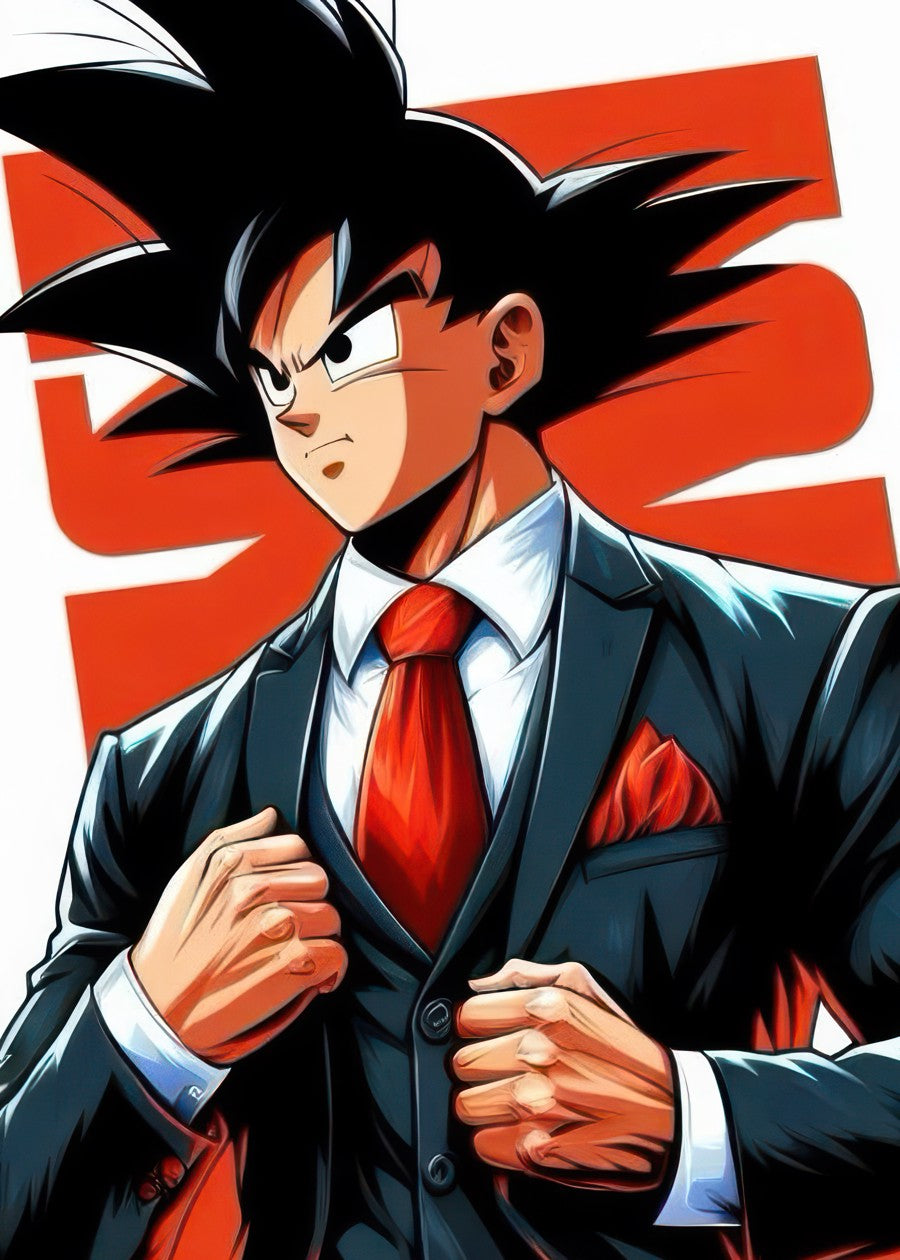 Goku dressed in a sharp suit, blending anime style with business elegance.