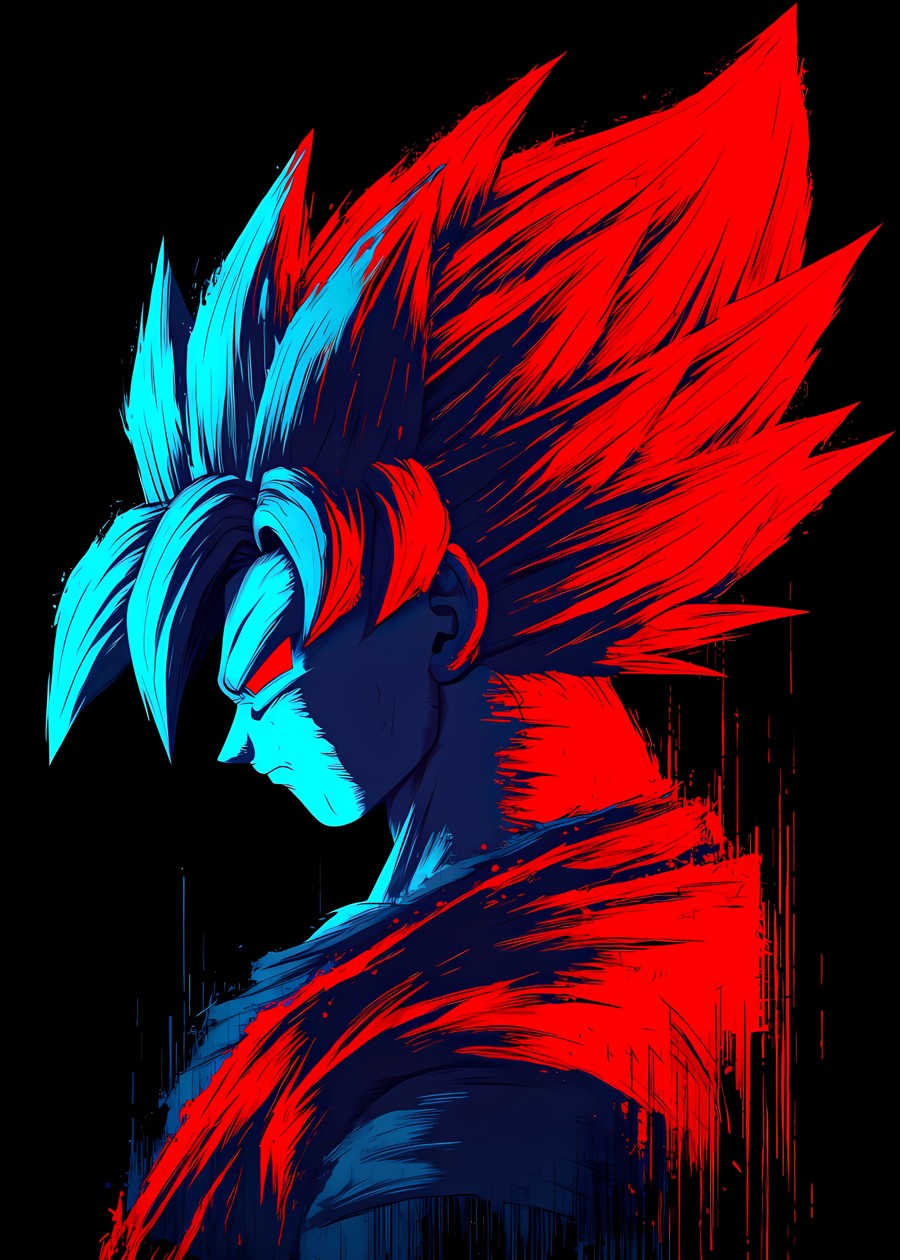 Neon-styled Super Saiyan Blue Goku radiating fierce red and blue aura, capturing his energy and determination in Dragon Ball Super.