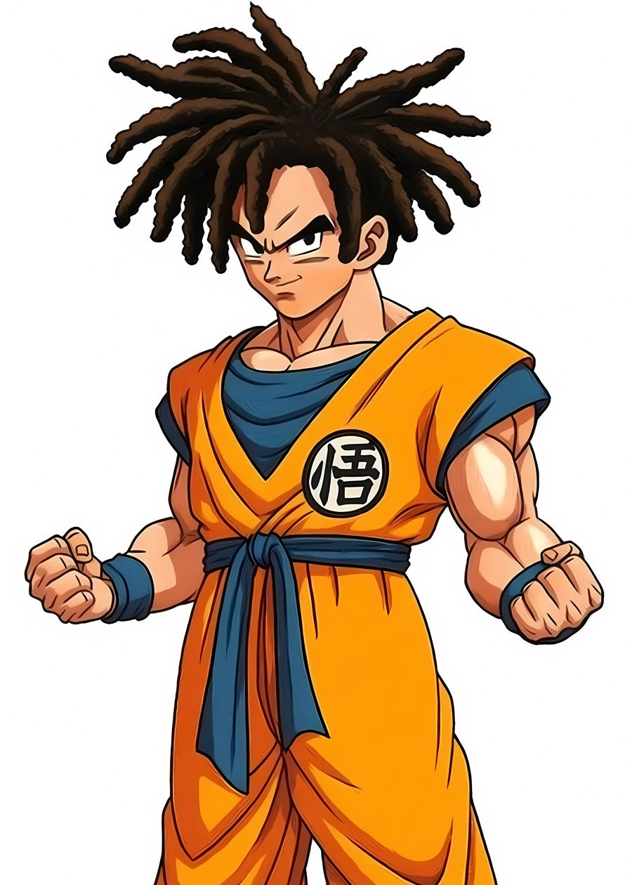 Goku reimagined with dreadlocks — a bold fusion of street culture and Saiyan power. Wearing his signature orange gi with a confident stance.