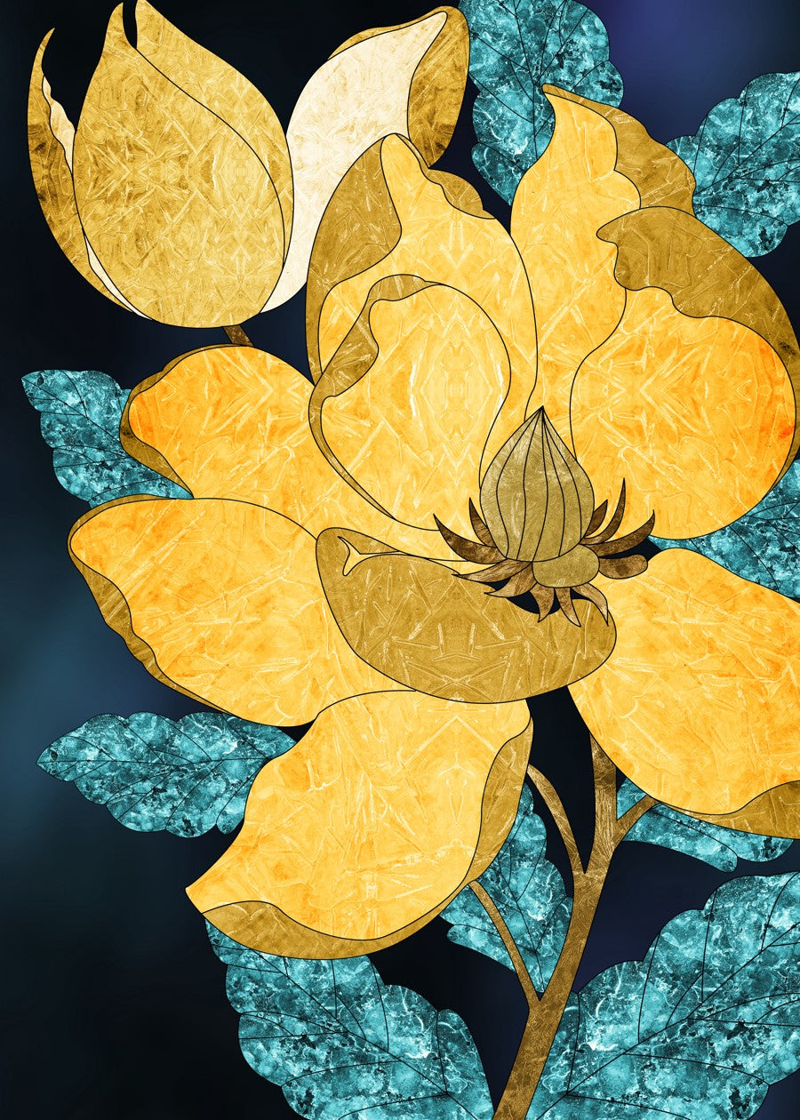 A radiant golden floral illustration with textured blue leaves on a deep, moody background.