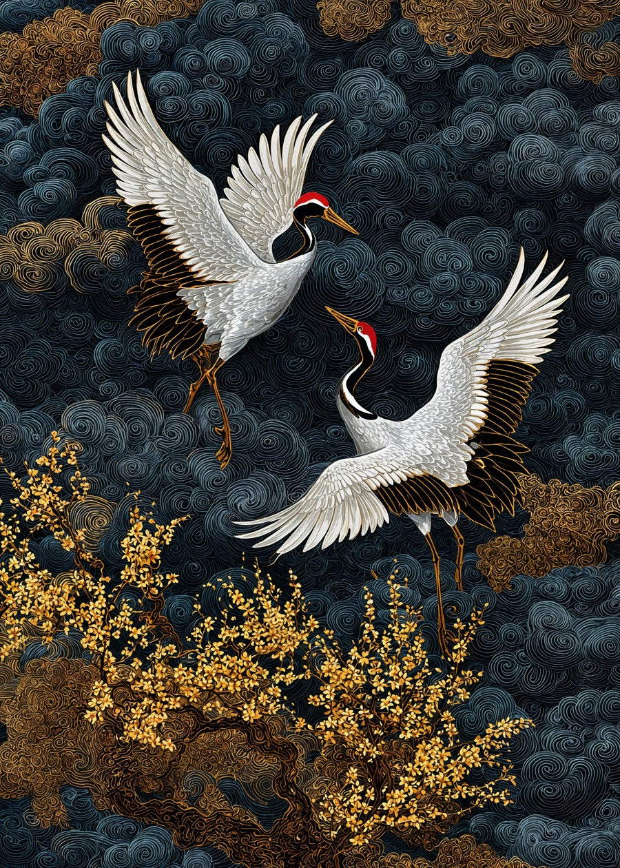 Two white cranes rise in a swirling sky, dancing above golden blossoms in a scene of love, freedom, and spiritual harmony.