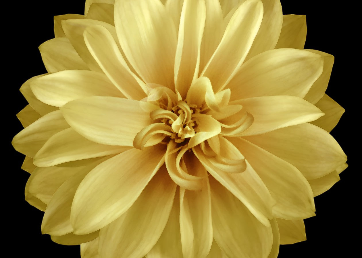 A radiant golden dahlia in full bloom—its layered petals glow with warmth and grace against a bold black backdrop.