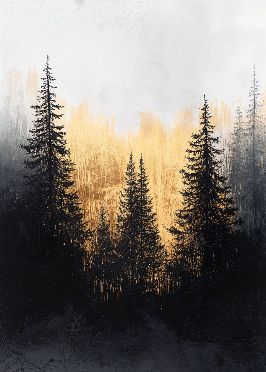 Dark pine silhouettes meet radiant golden light in this abstract forest landscape, evoking mystery, calm, and inner fire.